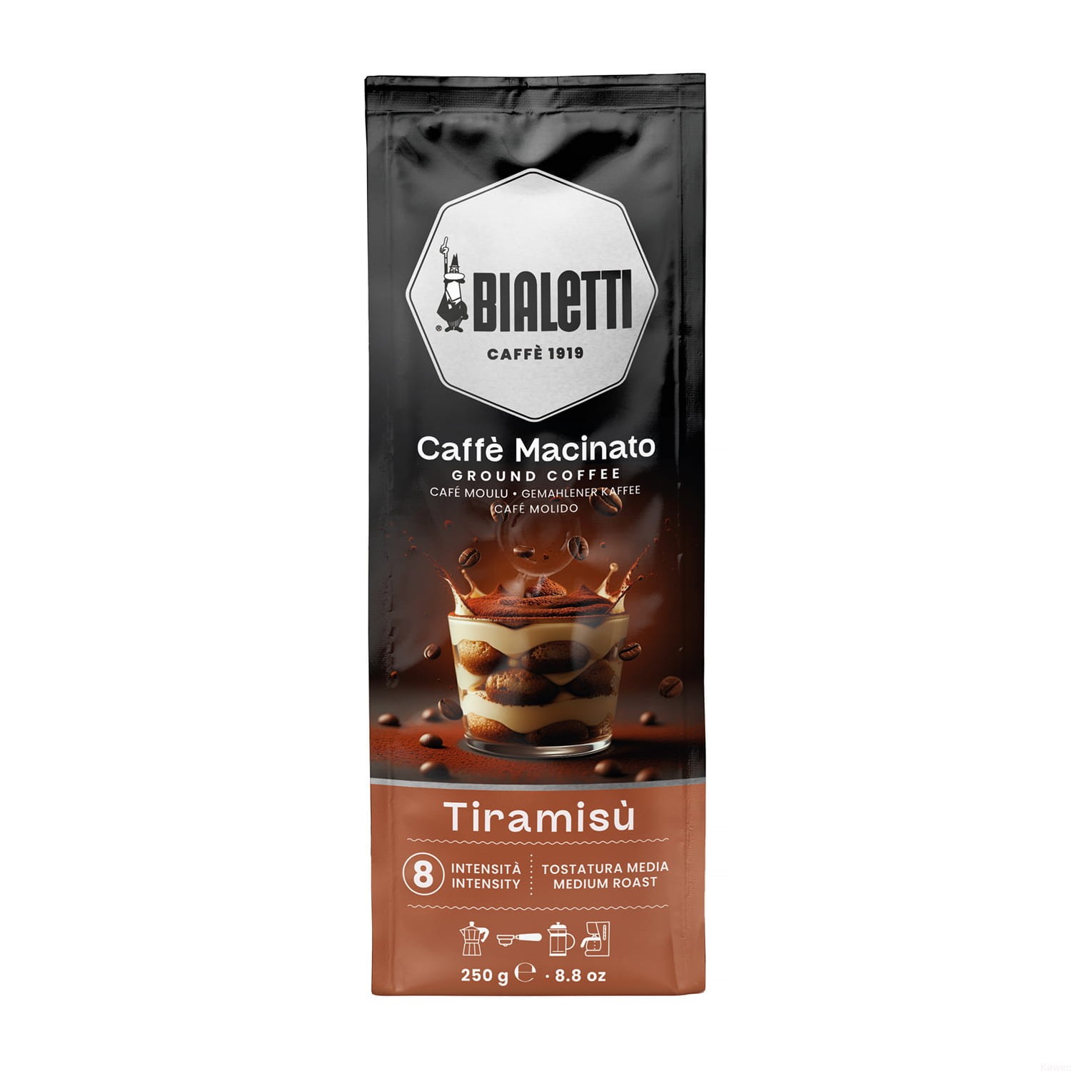 Bialetti Caffe Macinato Tiramisu z pewnością trafi w gusta większości kawoszy. Idealnie nada się jako miłe rozpoczęcie poranka, kawę do popołudniowego deseru czy na spotkanie ze znajomymi. Niezwykły smak i aromat kawy oczaruje każde podniebienie i zostanie zapamiętany przez długi czas.